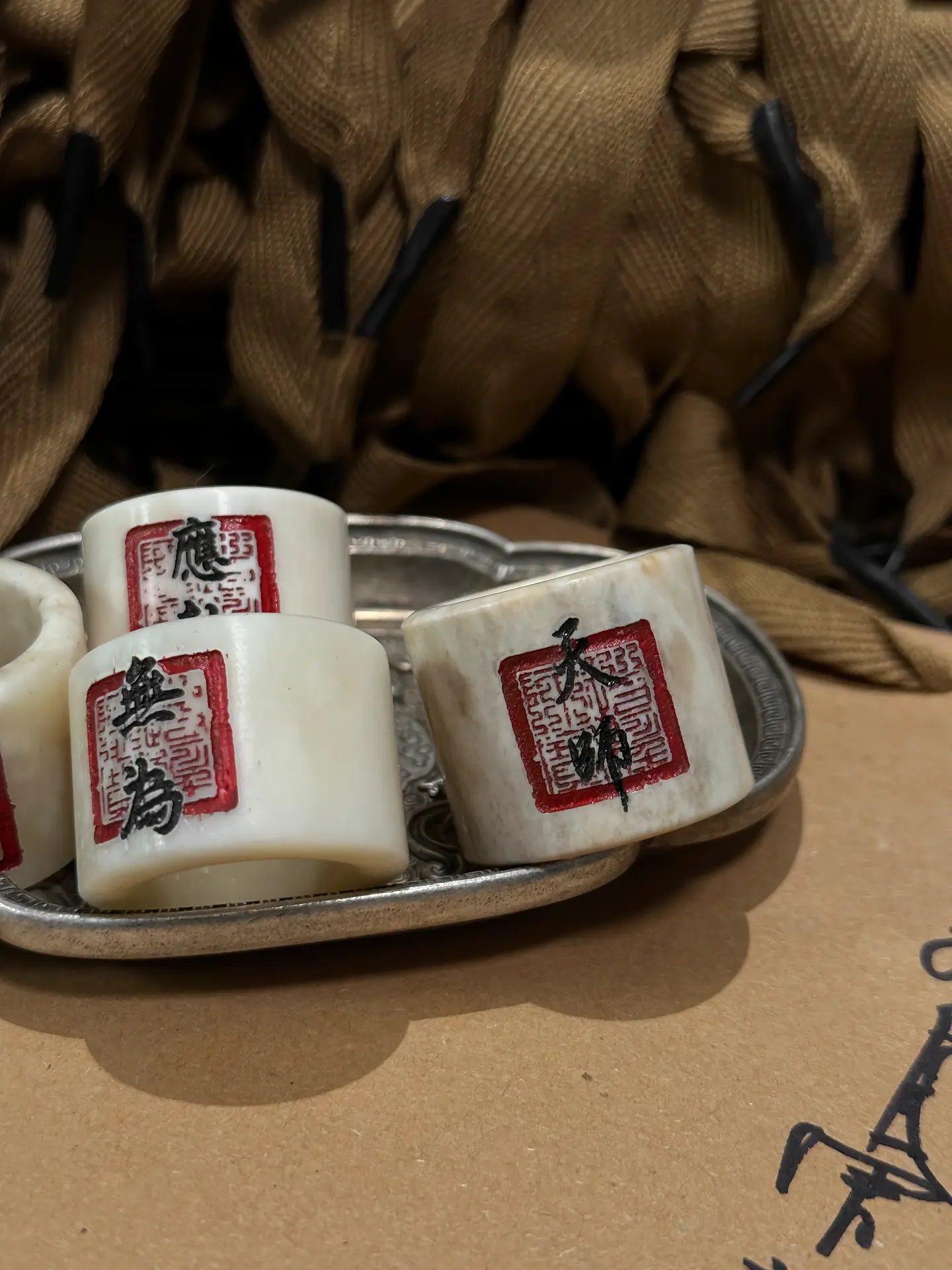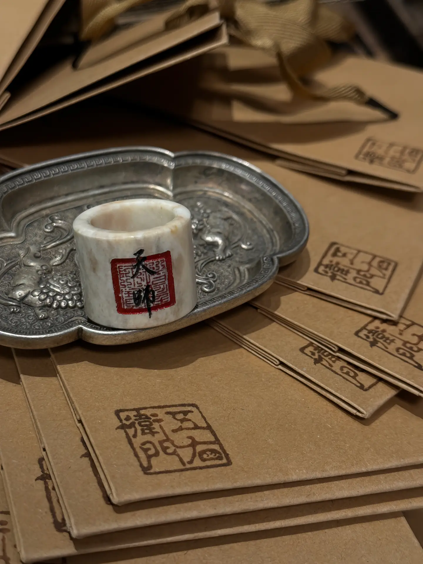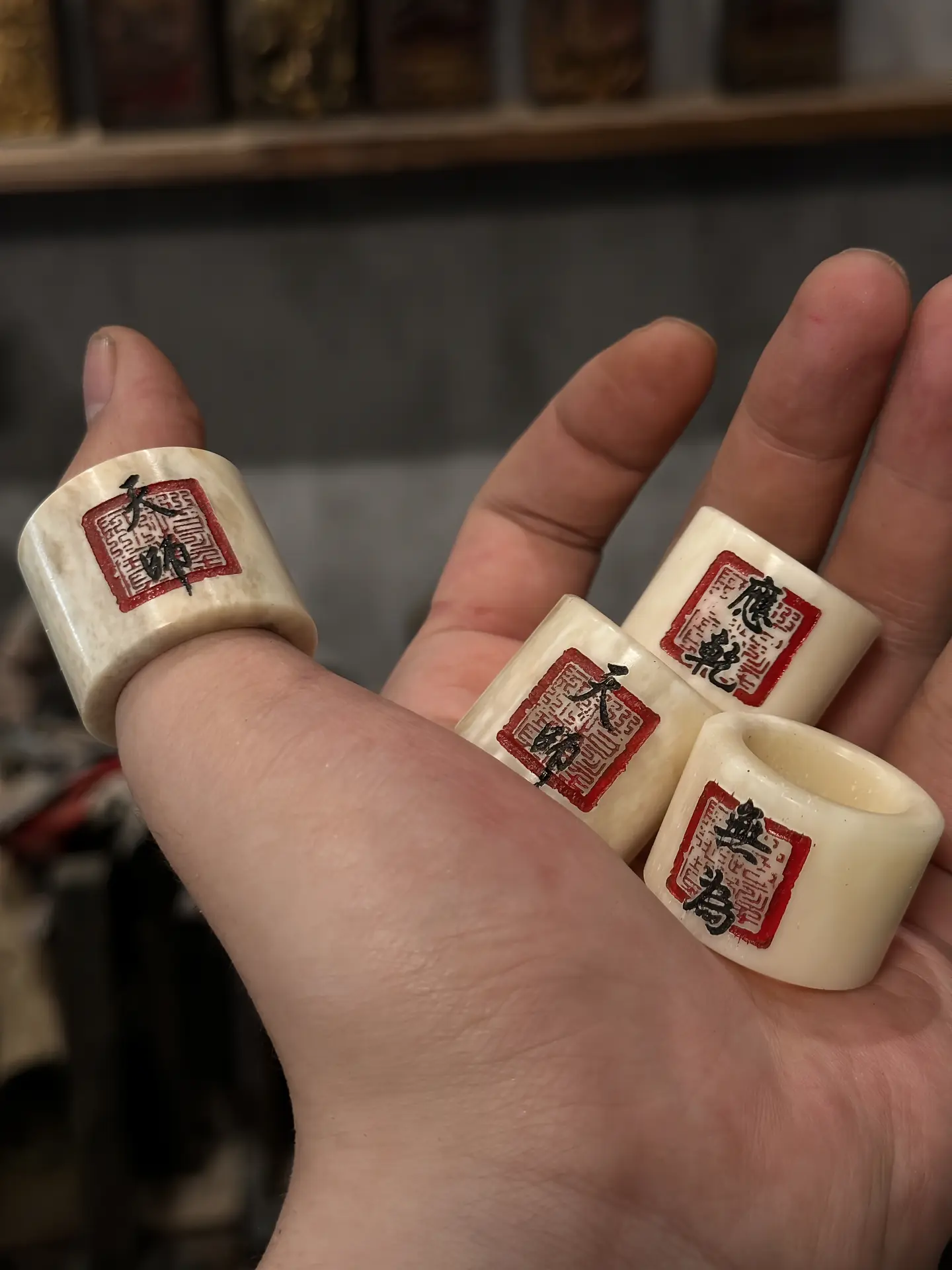 This thumb ring is made of natural bone material, hand-carved by craftsmen, integrating traditional Chinese Taoist cultural elements. It is engraved with classic Taoist cultural characters such as “Tianshi (Heavenly Master)”, “Ying Qian”, “Wu Wei (Inaction)”, and is matched with traditional seal carving pattern design, full of ancient charm. With a simple and elegant shape and comfortable wearing, it is not only a good product for antique collection, but also a personalized accessory that highlights the heritage of Oriental culture, suitable for antique lovers and traditional culture lovers to wear and play daily.